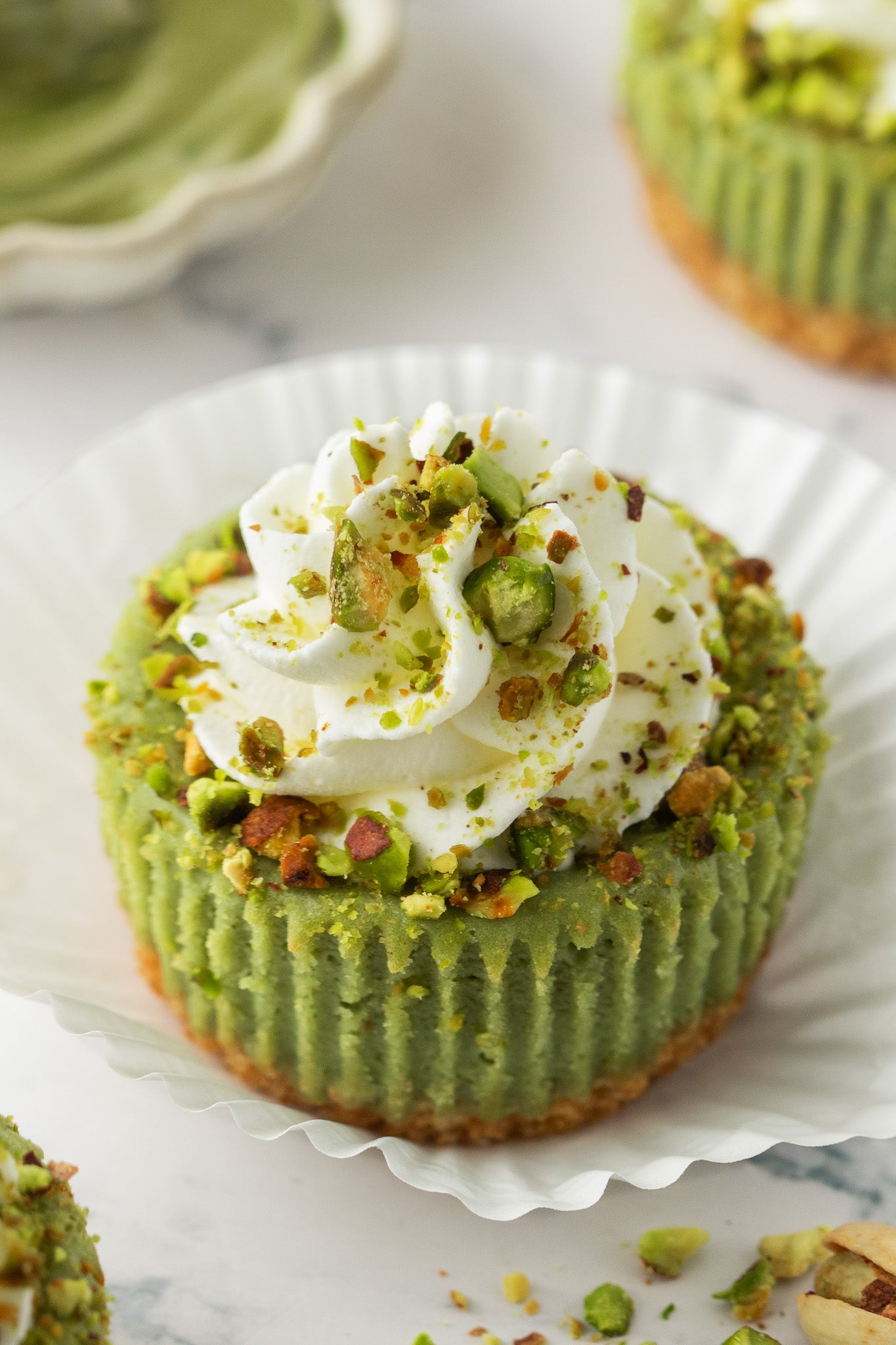 These Mini Pistachio Cheesecakes are creamy, nutty, and delicious. Each cheesecake starts with a buttery graham cracker crust, followed by a smooth pistachio cheesecake filling made with rich pistachio cream. They’re topped with fresh whipped cream and a sprinkle of chopped pistachios.